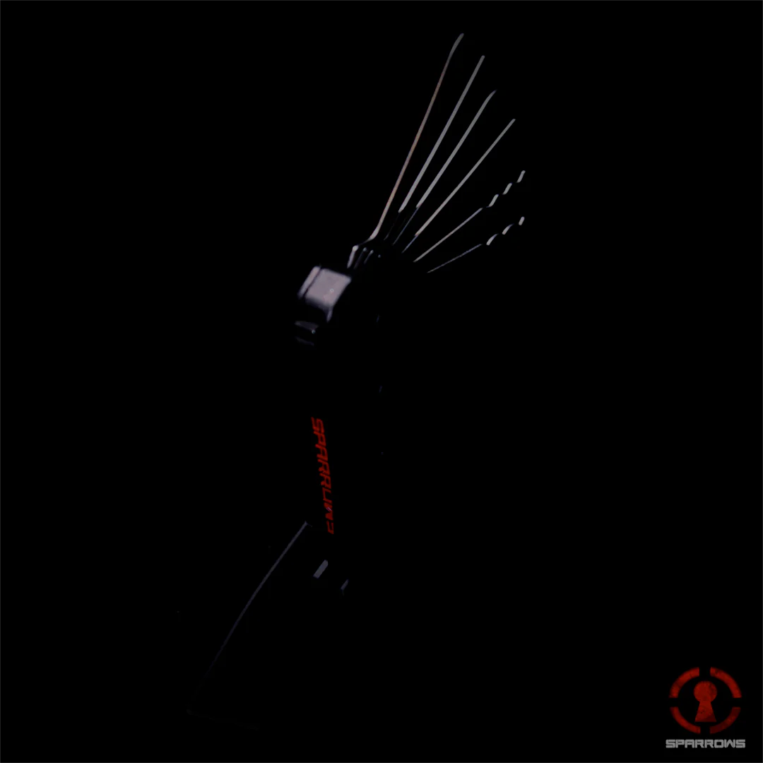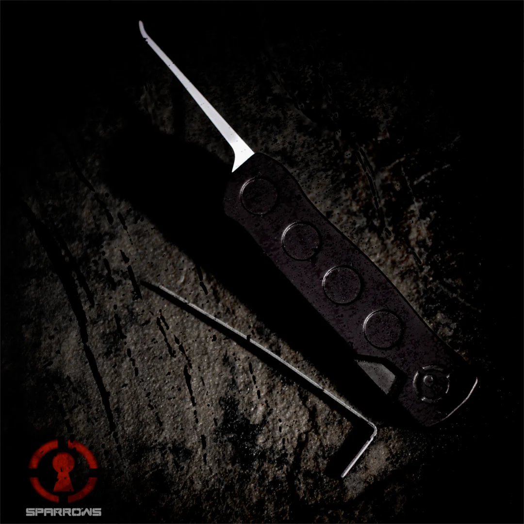 The ESCORT has everything you will need for when those unscheduled events occur. This folding lock pick set has a well balanced combination of hooks and rakes and a tension wrench that is easily accessible. Some key features are a full locking bar for all the picks and a tension wrench that easily slides out a trap door. When not in use all the picks are locked in place and the tension wrench is securely held within the frame giving you a tool that has a compact size you can easily incorporate into your EDC.