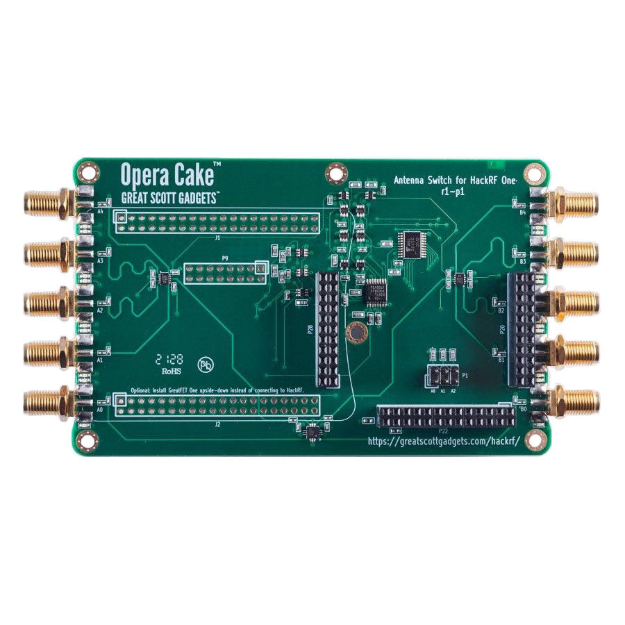 Opera Cake is an antenna switching add-on board for HackRF One that is configured with command-line software either manually, or for automated port switching based on frequency or time. It has two primary ports, each connected to any of eight secondary ports, and is optimized for use as a pair of 1x4 switches or as a single 1x8 switch. Its recommended frequency range is 1 MHz to 4 GHz.